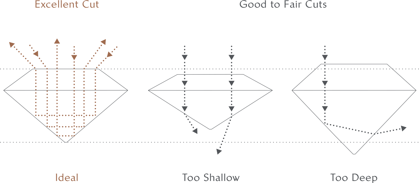 Proportions play a significant role in the cut of a diamond. The most beautiful diamonds are cut to strictly defined cut proportions to ensure the maximum return of brilliant light, dispersed light and scintillation from a diamond. If a diamond is cut too deep, a dark centre will emerge in the stone. On the other hand, a diamond that is cut too shallow will set off a dull hollow appearance.